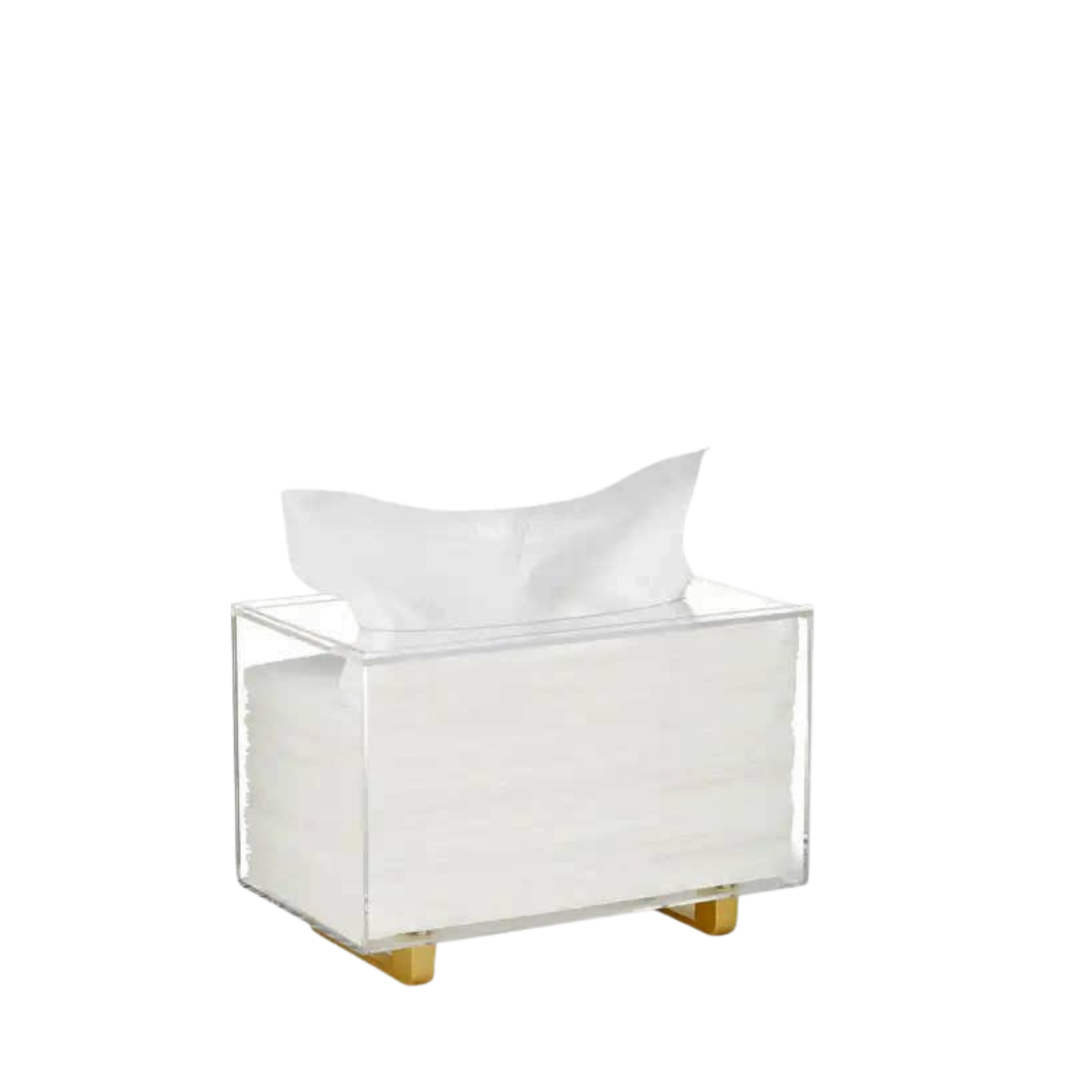 Spruce up your space with this Acrylic Tissue Box! Its clear holder on gold legs not only adds a touch of elegance but also perfectly fits "KLEENEX" brand tissues, keeping them in reach. Say goodbye to messy boxes and hello to a stylish solution!