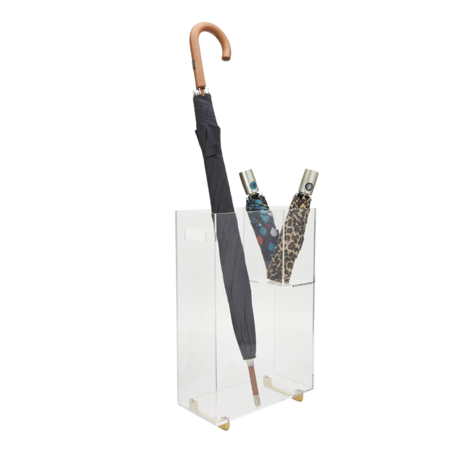 Expertly designed, this acrylic umbrella stand on elegant gold legs is a sleek and practical addition to any entryway. With separate slots for tall and small umbrellas, it keeps your space organized and clutter-free.